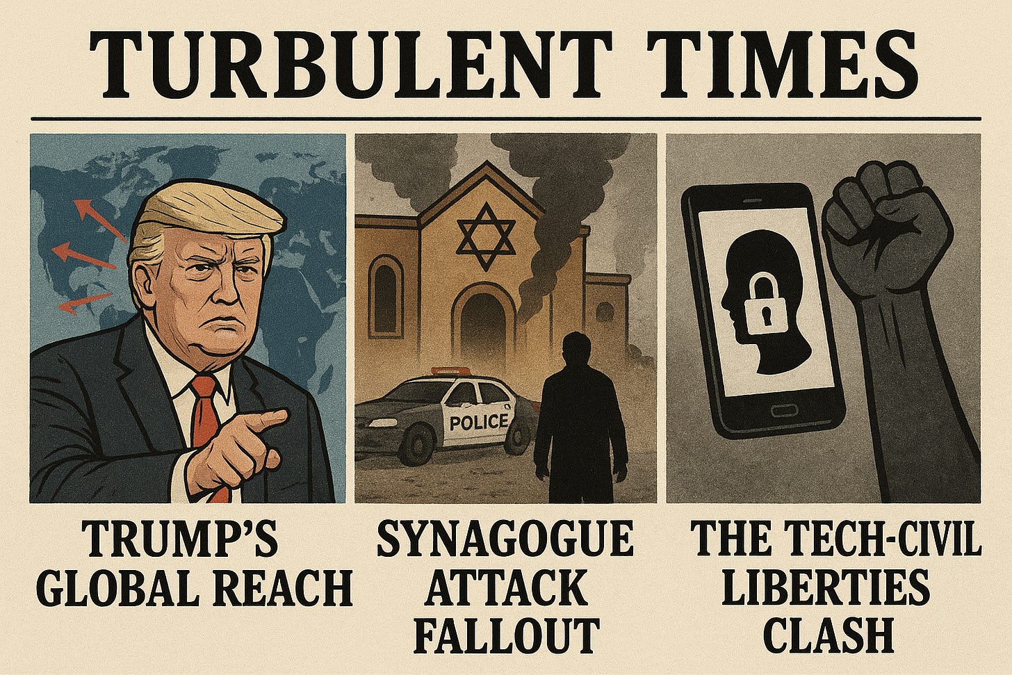 Turbulent Times: Trump’s Global Reach, Synagogue Attack Fallout, and the Tech-Civil Liberties Clash
